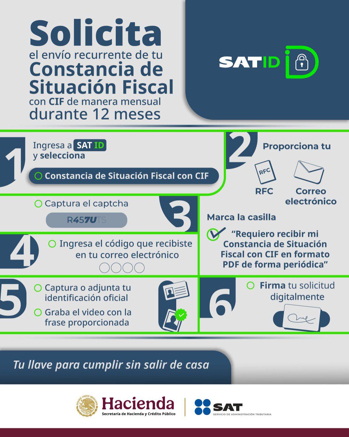 Hacemos de su conocimiento que a través de la aplicación “SAT ID”, además de poder solicitar la generación de Generación de contraseña, Renovación de la e.firma y Constancia de Situación Fiscal, ahora también podrán solicitar por ese medio el envío recurrente de su Constancia de Situación Fiscal (CSF) de manera mensual, durante 12 meses.