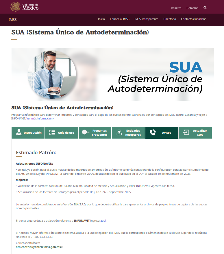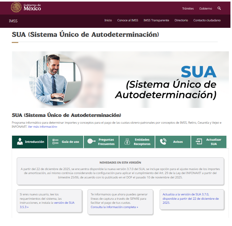 Informamos a ustedes que, a partir del día de hoy, 22 de diciembre de 2025, se encuentra disponible en el portal del IMSS la nueva versión 3.7.0 del SUA (Sistema Único de Autodeterminación).